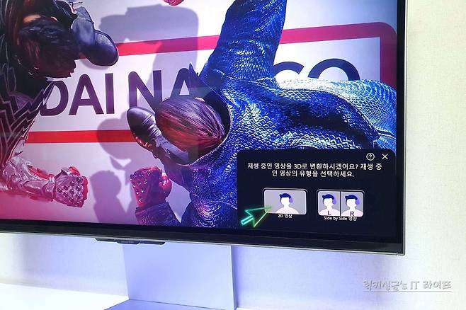 유튜브 2D 영상을 3D 입체 영상 변환으로 시청하는 방법과 동일한데요. 철권 8을 실행하자마자 3D 화면 전환 메시지 창이 표시되면 재빨리 영상 유형을 '2D 영상'으로 선택해 줬어요.