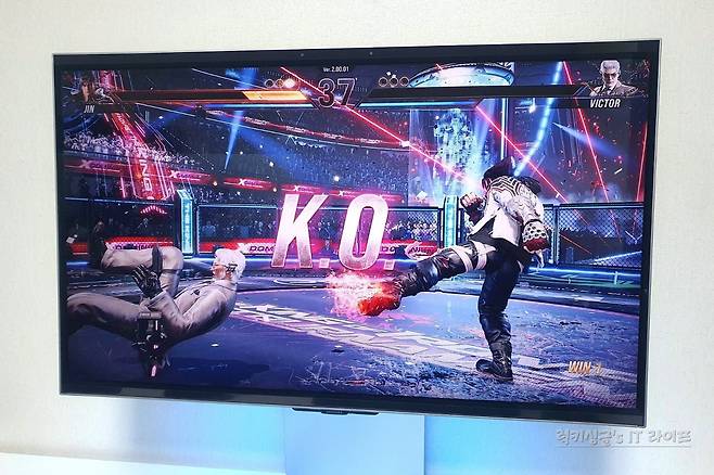 본격적으로 게임이 실행되자 3D 영상 변환으로 시청할 때와 마찬가지로 게임 속 공간이 모니터 안쪽과 디스플레이 표면 밖으로 확장되더라고요. 또한 게임 속 파이터들의 이미지가 모니터 밖으로 돌출되면서 입체감 있게 표현됐는데요. 3D 입체 환경에서는 파이터들의 움직임뿐만 아니라 화려한 타격 그래픽 효과가 묘사될 때 표현 범위가 시각적으로 더욱 확대되는 느낌이었어요.