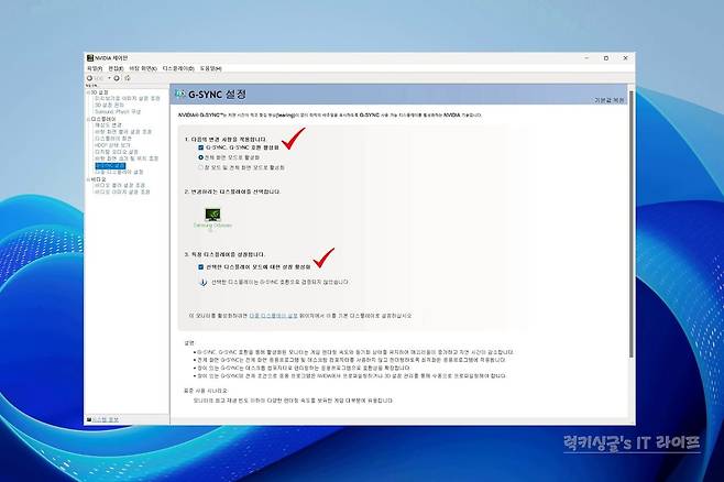 제 경우에는 NVIDIA Geforce RTX 4070 SUPER 그래픽카드를 사용하고 있는데요. NVIDIA 제어판에서 'G-Sync 호환 활성화' 설정 체크와 함께 삼성 오디세이 G90XF 게이밍 모니터를 '특정 디스플레이 모드에 대한 설정 활성화'로 체크하면 지싱크 호환 설정 완료에요. 또한 엔비디아 제어판에서 'G-Sync 호환 표시기' 켜기 하면 게임 플레이할 때 G-Sync 동작 여부를 확인할 수 있어요.