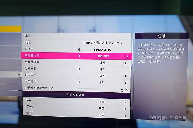 해상도는 4K, 그래픽 옵션은 최고 높음, 프레임 속도는 165Hz 고주사율 설정에서도 그래픽 카드 렌더링 속도와 모니터 주사율이 완벽하게 싱크 동기화되더라고요. 그동안 60Hz 모니터에서 스트레스받았던 화면 끊김 (Stuttering) 증상뿐만 아니라 빠르게 화면 전환할 때 화면이 찢어지는 티어링 (Tearing) 현상까지 싹 사라졌어요.