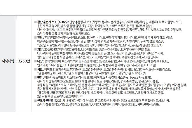 우선 유출을 가장해 공개한 상세 가격표를 살펴보겠다. 기본 등급인 STD의 주요 기본 적용 품목으로는, 12.3인치 디지털 클러스터와 순차점등 턴시그널 램프, 이중 접합 윈드실드 글래스, 1열 통풍 시트, 2열 시트 센터 암레스트, IACC (인텔리전트 어댑티브 크루즈 컨트롤), 듀얼존 풀오토 에어컨 등이 기본 적용되어 매우 출중한 구성을 보여준다. 세제 혜택 후 4,800만 원의 가격이다.
