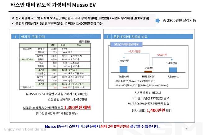 세일즈 가이드를 잠시 살펴보면, 보조금에 소상공인 보조금 및 부가세 환급까지 모두 받았을 때 소상공인 실 구매가가 3,410만 원으로 기재되었다. 타스만은 사업자 부가세 환급만 가능하다는 지점을 강조하였는데, 사실 타스만 기본모델에도 부가세 환급을 진행하면 기본 시작 가격에 큰 차이는 나지 않을 전망이다. 무쏘 EV의 장점은 역시 순수 전기차인 만큼 유류비에서 벌어질 것으로 보인다.