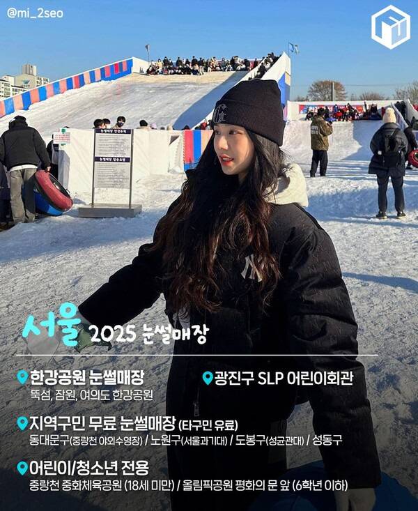 서울 곳곳에도 눈썰매장이 위치해있어 도심 속에서 눈썰매를 즐길 수 있습니다. 가장 유명한 한강공원 눈썰매장은 뚝섬, 잠원, 여의도 한강공원에 조성되어 있으며 대형 슬로프와 소형 슬로프로 구분되어 운영되고 있습니다. 약 9m 대형 슬로프는 출발지점에서 제법 아찔함까지 느낄 수 있죠.