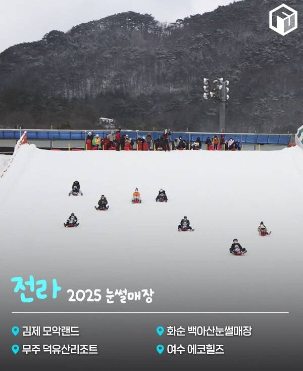 김제 모악랜드와 무주 덕유산리조트, 화순 백아산눈썰매장, 여수 에코힐즈에 눈썰매장이 위치해있습니다. 대부분 단일 슬로프로 운영되고 있으며 화순 백아산 눈썰매장은 제법 가파른 경사로 어른들도 즐기기 좋습니다.