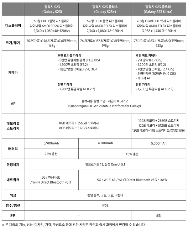 갤럭시 S23과 갤럭시 S23+는 8GB RAM을 기본으로 각각 256GB, 512GB 스토리지를 탑재했다. 갤럭시 S23은 256GB, 512GB 모델이 각각 115만 5,000원, 127만 6,000원이고, 갤럭시 S23+는 256GB, 512GB가 각각 135만 3,000원, 147만 4,000원이다.