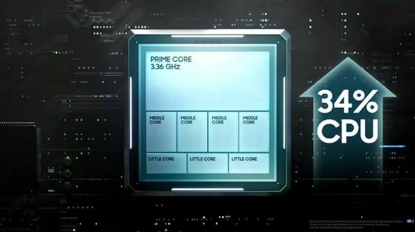 갤럭시 S23 시리즈에 들어간 퀄컴 스냅드래곤 8 Gen 2 모바일 플랫폼은 최대 3.36GHz 클럭으로 동작하는 Arm Cortex-X3 아키텍처 프라임 코어 1개와 4개의 퍼포먼스 코어, 그리고 3개의 에너지 효율 코어로 구성된 8코어 Kyro CPU로 이전 세대보다 CPU 성능이 34% 향상됐다. AI의 핵심인 딥러닝 알고리즘을 담당하는 NPU 성능은 49% 개선되어 사진 촬영 등에서 성능과 전력의 균형을 최적화했다.