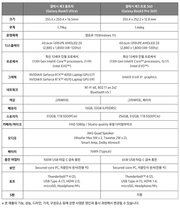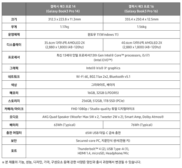 갤럭시 북3 프로는 초슬림·초경량 제품으로 갤럭시 북3 프로 14(35.6cm)와 16(40.6cm) 두 가지 모델로 출시된다. 특히 35.6cm 제품은 1.17kg의 무게, 두께는 11.3mm에 불과해 콤팩트한 사이즈와 높은 휴대성을 제공한다.