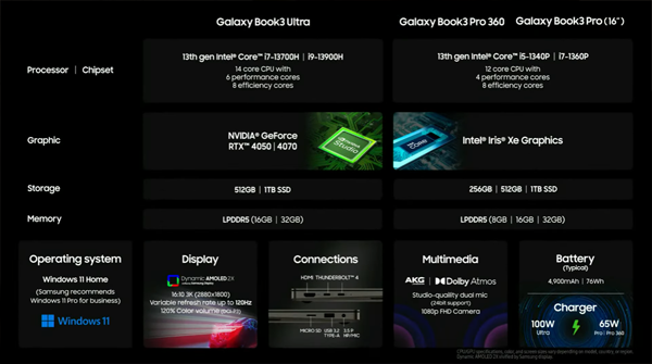 삼성전자는 갤럭시 언팩 2023에서 신규 프리미엄 노트북 '갤럭시 북3' 시리즈를 공개했다. 최고 사양을 갖춘 고성능 프리미엄 모델은 '갤럭시 북3 울트라'와 360도 회전하는 터치스크린에 S펜을 지원하는 '갤럭시 북3 프로 360', 얇고 가벼운 클렘쉘 디자인의 '갤럭시 북3 프로'로 구성된다.