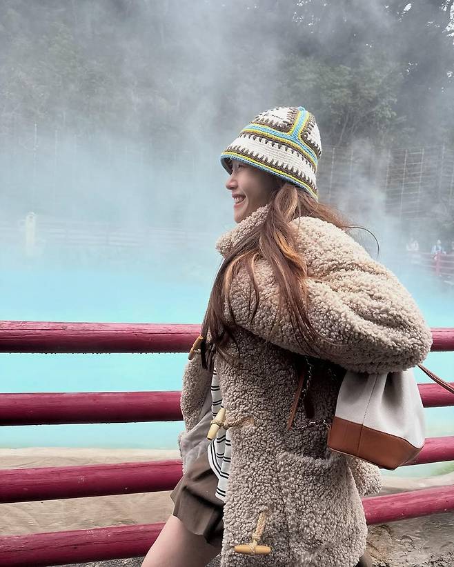 또 다른 사진에서는 핫스프링을 배경으로 한 장면이 담겨 있다. 그녀는 스팀이 피어오르는 온천 앞에서 옆모습을 드러냈고, 환하게 웃는 얼굴과 내추럴하게 풀어진 긴 머리가 한 폭의 화보처럼 느껴진다. 배경과 어우러진 따뜻한 컬러감의 룩은 겨울 감성에 딱 맞춘 듯 조화롭다.