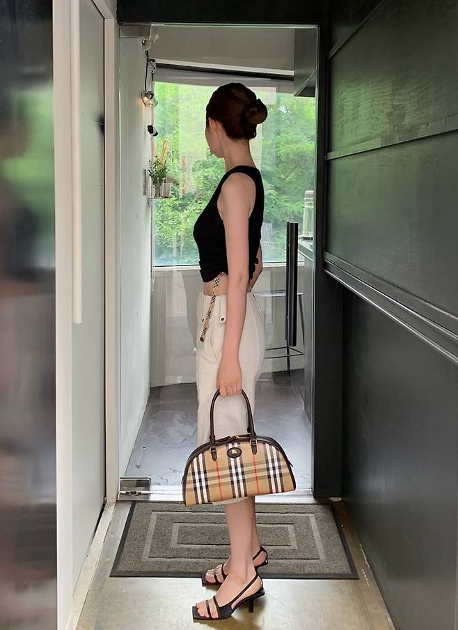 클래식한 체크 패턴이 매력적인 버버리 토트백은 룩에 고급스러운 무드를 더하며, 블랙 스트랩 힐 샌들과 미니멀한 블랙 선글라스로 마무리한 스타일링은 도심 속 ‘쿨 걸’ 무드를 극대화한다.