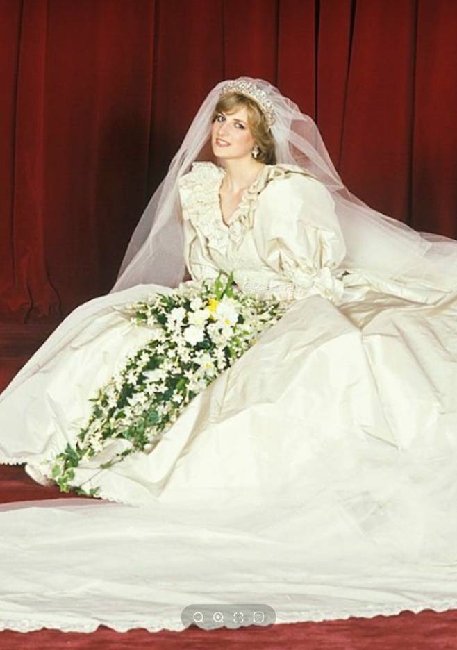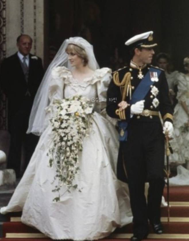금명이 드레스처럼 풍성한 소매와 러플 장식은 1981년 다이애나 왕세자비 웨딩드레스를 떠올리게 하는데요. 당시 7억 5천만 명이 시청했다는 세기의 결혼식! 얼마나 많은 여성들이 다이애나 스타일을 따라 하고 싶었을지 상상초월이죠? 에마누엘 부부가 디자인한 아이보리 컬러 드레스는 제작 기간만 3개월, 1만 개의 진주, 8m의 긴 베일이 사용되었다고 해요. 허리부터 풍성하게 퍼지는 라인하며, 진짜 화려함의 끝판왕👑