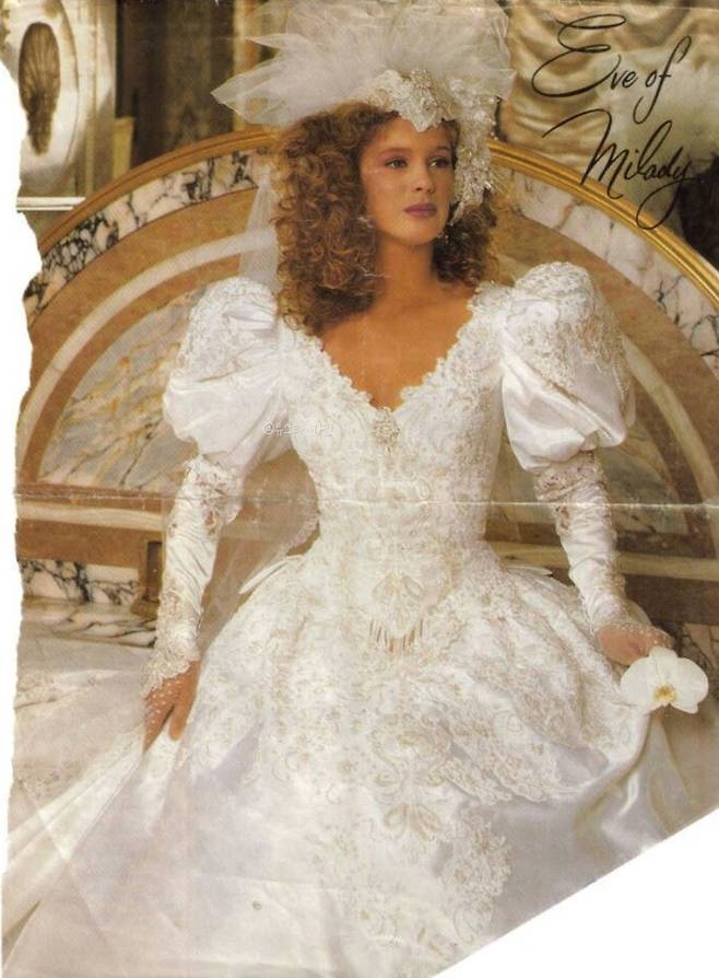8090년대 웨딩드레스 스타일의 핵심은 바로 과장된 어깨선! 덕분에 허리 라인이 더 슬림해 보이는 효과까지 있대요. 게다가 긴 트레인, 화려한 베일, 레이스 헤드피스까지 풀 장착하면 시선 강탈 쌉가능! 😎