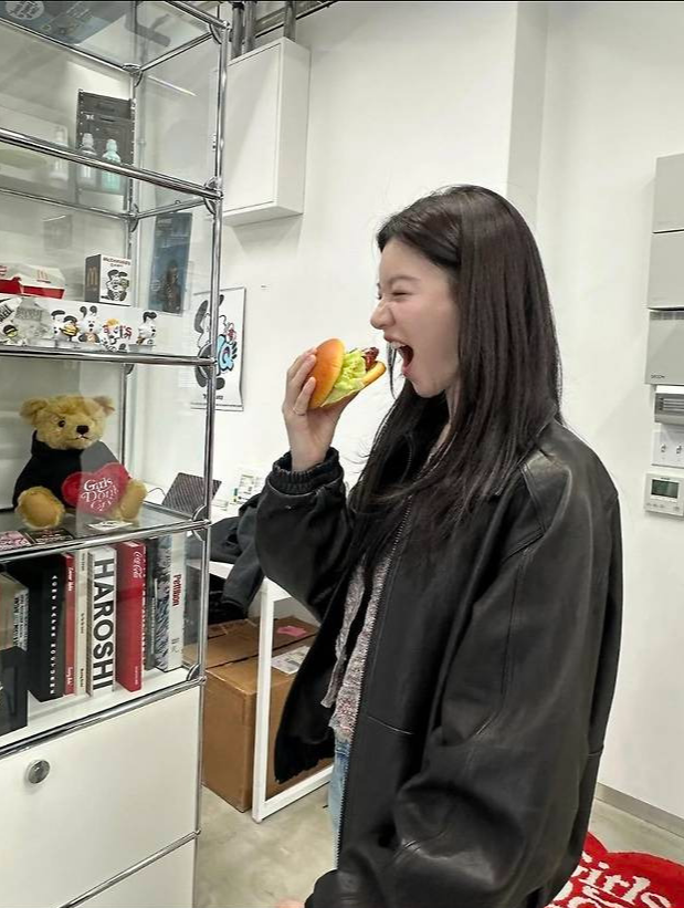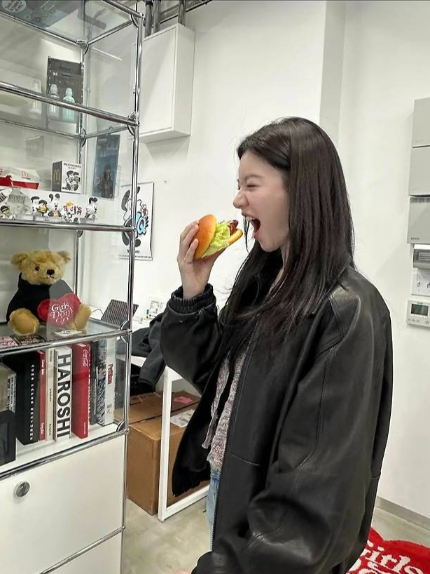 고윤정은 빈티지한 무드의 오버핏 레더 재킷을 걸치고, 안에는 후디와 티셔츠를 레이어드해 트렌디한 스트릿 스타일을 연출했습니다.