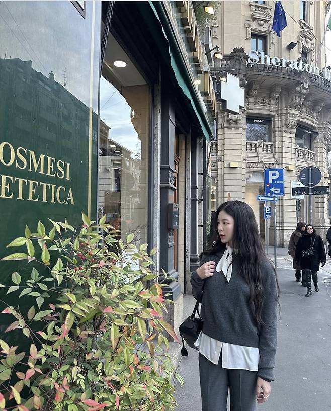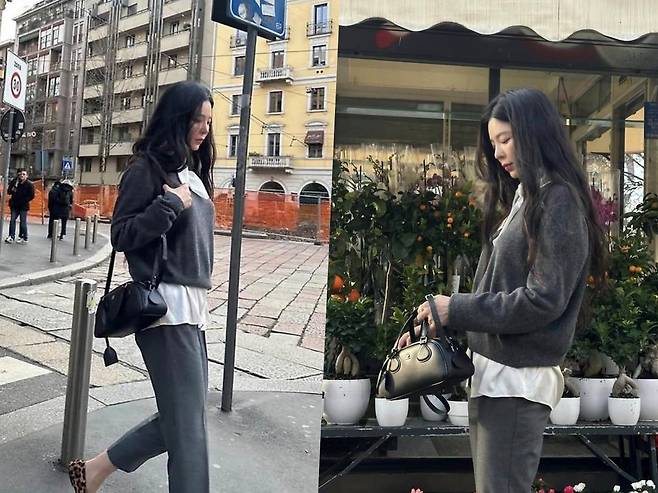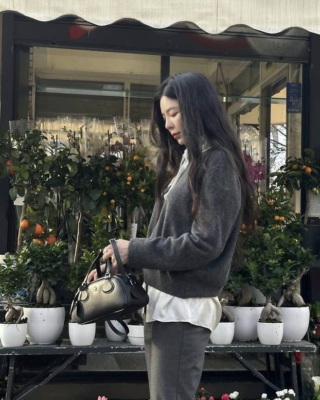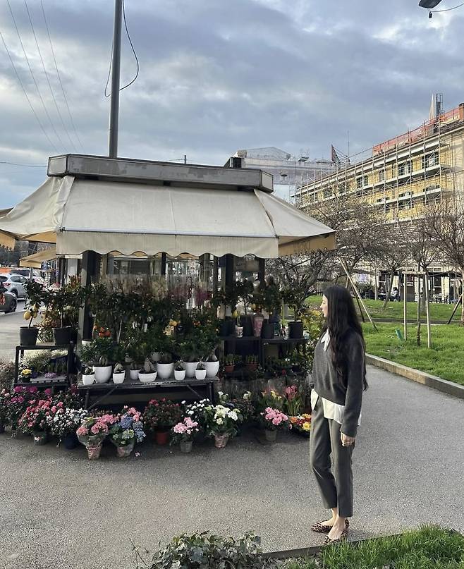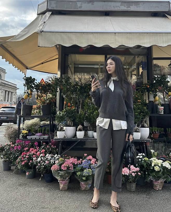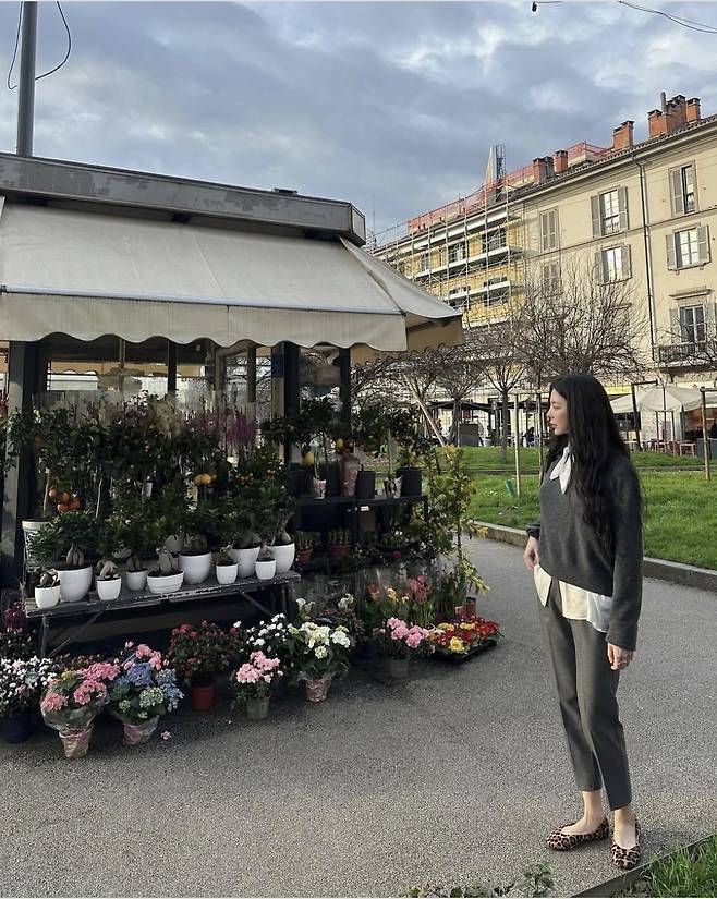 꽃가게와 유럽 도시풍 거리에서 찍힌 사진은 마치 잡지 속 한 컷처럼 감성적이면서도 실용적인 스타일을 잘 담아냈습니다.