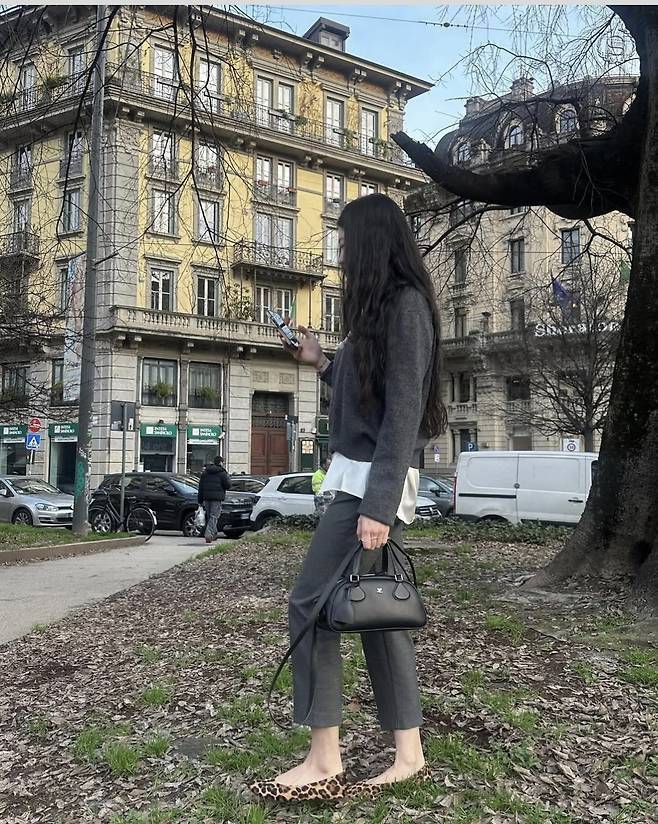 포인트는 단연 레오파드 플랫 힐. 전체적인 무채색 조합 속 야성적인 무드를 더한 슈즈 선택으로 시선을 사로잡았으며, 블랙 백과 자연스러운 웨이브 헤어가 장재인 특유의 자유롭고 감각적인 분위기를 배가시켰습니다.