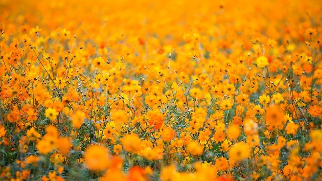 노을이 지는 시간에 황화 코스모스 밭으로 들어가 사진을 찍으면, 그것은 진정한 '인생샷'이 될 것이다.