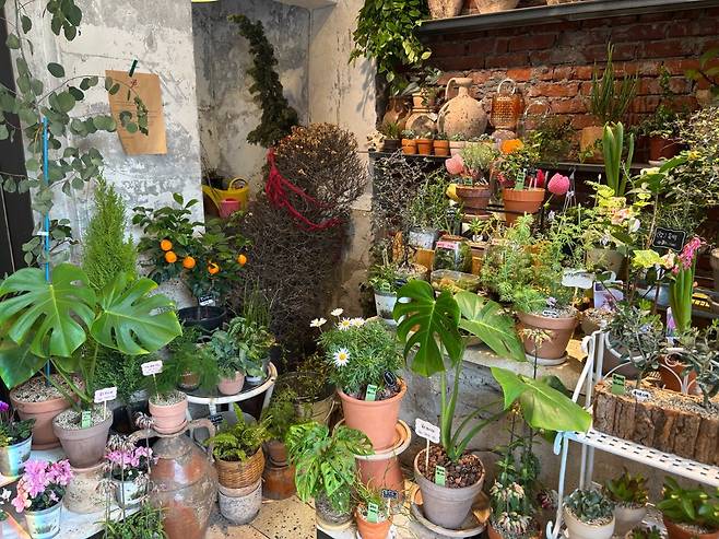 늦은 오후에 방문했지만 매장 내부에는 여러 손님들로 이미 가득 차 있었다. 베이커리카페 답게 이곳에서는 커피뿐만 아니라 다양한 디저트를 판매하고 있었는데 다른 카페와 달리 버섯이나 감태를 활용해 만든 디저트들을 볼 수 있었다. 매장 입구에는 꽃이나 화분 등을 판매하는 작은 꽃집도 있었는데, 일부러 이곳에 들러 작은 화분을 사가는 사람들도 있었다.