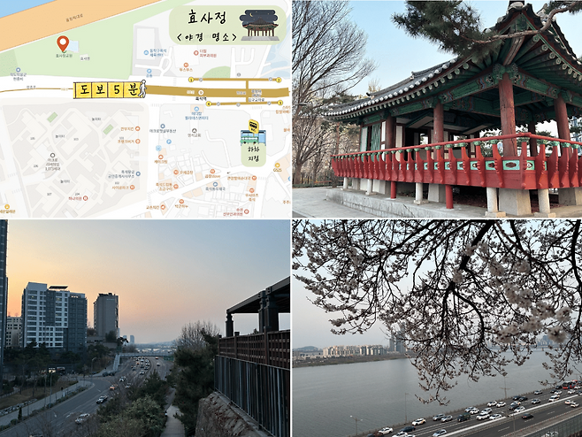서울 야경 명소하면 가장 먼저 떠오르는 곳은 낙산공원, 남산인데 ‘효사정’은 상대적으로 덜 알려져 있다 보니 여전히 동네 주민들과 중앙대 생들이 방문하고 않다. 5511번 버스를 타고 ‘흑석역. 흑석동빗물펌프장’ 정류장에서 하차하면 방문할 수 있는 효사정은 중앙대 후문 인근의 흑석동 언덕에 위치한 아담한 정자다.