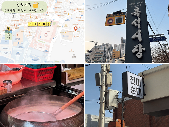 ‘중앙대학교’ 정류장에서 하차해 도보 5분 거리에 위치한 흑석시장은 중앙대 학생들에게 오랜 세월 ‘해장 성지’로 통했다. 특히 공대생들 사이에서는 “흑석시장에서 순댓국을 안 먹어본 공대생은 없다”는 말까지 있었을 정도다. 최근에는 가수 성시경의 유튜브 채널 ‘먹을텐데’에 흑석시장 내 순댓국집이 소개되면서 외부인들에게까지 ‘맛집 성지’로 재조명되고 있다.