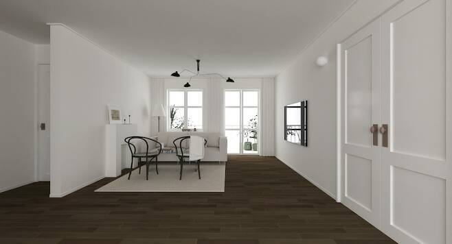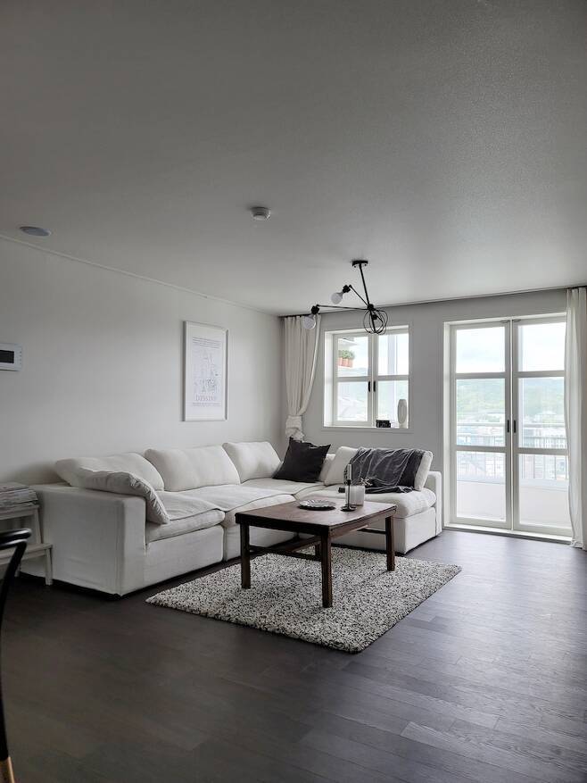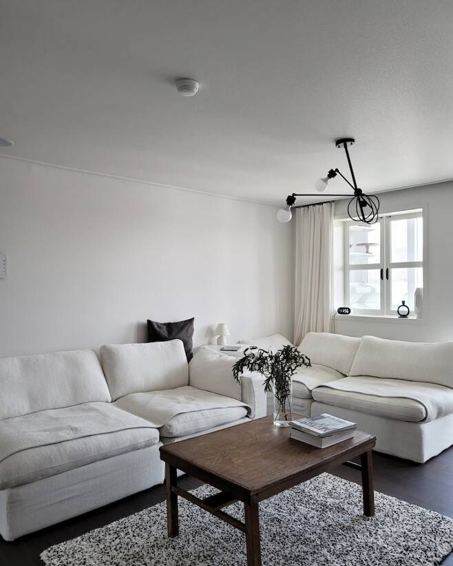 드디어 공사가 끝나고 입주한 뒤 가구, 소품을 들였을 때의 모습입니다. 가상으로 구현했던 것과는 여러 요인으로 조금 달라졌지만, 전체적인 느낌은 어느 정도 나온 것 같습니다. 전체적으로는 크림처럼 따뜻한 화이트컬러에 바닥은 묵직한 월넛 컬러의 강마루를 시공했습니다.