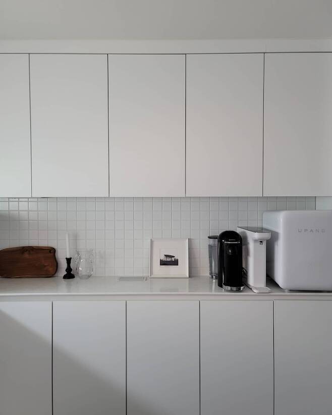 주방은 최대한 힘을 빼고 단순한 스타일로 쾌적함을 유지하고 싶어서 싱크대 인조대리석 상판도 얄상하게 올리고 손잡이도 히든 타입으로 시공하였습니다.