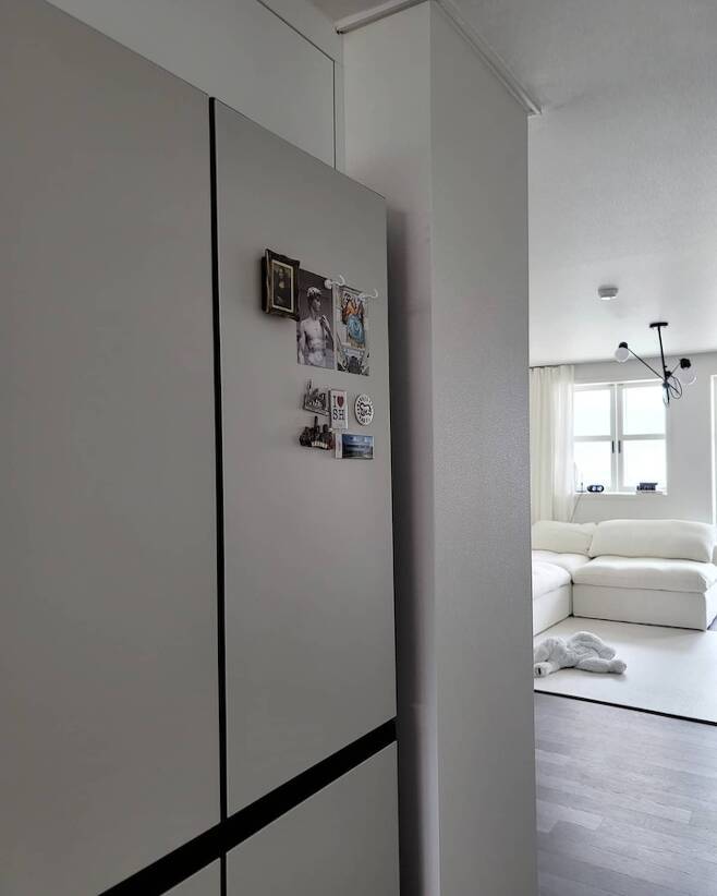 냉장고는 기둥 벽 뒤에 숨어서 거실에서는 보이지 않습니다. 보여도 상관은 없지만요!