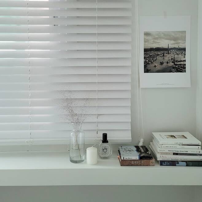 창문에 커튼을 설치하려고 했으나, 신혼집에서 사용하던 우드 블라인드를 재사용하였습니다. 저도 재사용 하는 것을 좋아하는 편인데 남편은 저보다 몇 배나 더 좋아합니다. 덕분에 신혼집 분위기와 크게 다르지 않습니다.