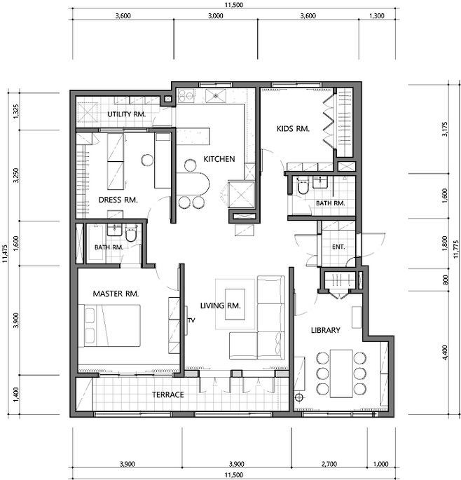 36평 전형적인 판상형 구조의 방 4개짜리 아파트입니다. 옛날에 지어진 집답게 현관이 좁은 게 단점입니다. 구조변경을 하려고 시도는 했으나 아파트 관리실에서 절대 불가하다고 하셔서 현재 구조에서 최대한 효율적으로 공간을 사용하려고 하였습니다.