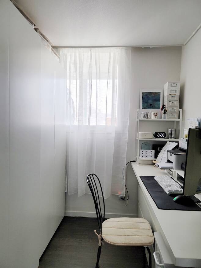 여기는 남편이 집에서 제일 애정하는 공간입니다. 듀얼 모니터를 두고 재택근무를 하거나, 온라인 게임을 주로 하면서 스트레스를 푸는 곳입니다. 책상 위는 남편의 영역이라 따로 건들지는 않고 있습니다. 어디서 들었는지 기억은 안 나지만 작더라도 부부가 각자 자기만의 공간을 가지고 있어야 좋다고 하네요!