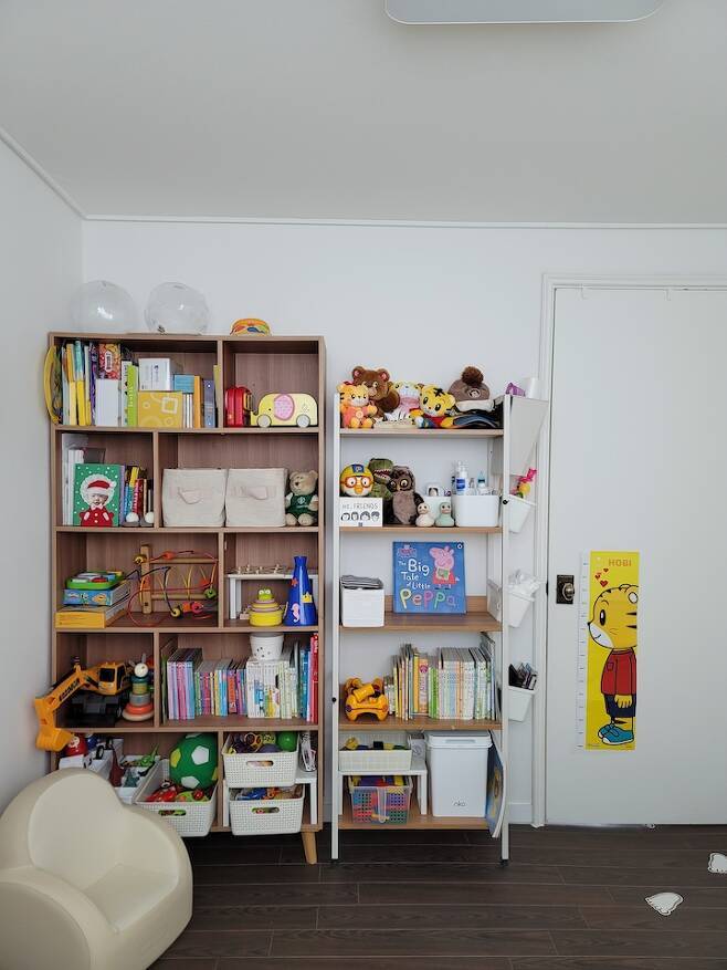 문 옆에는 제가 자취하던 시절부터 사용하던 책장 선반을 재활용해서 아이의 책, 장난감을 수납하였고, 미끄럼틀이나 부피가 큰 장난감들은 베란다에 두어서 방을 좀 더 넓게 사용할 수 있도록 하였습니다.