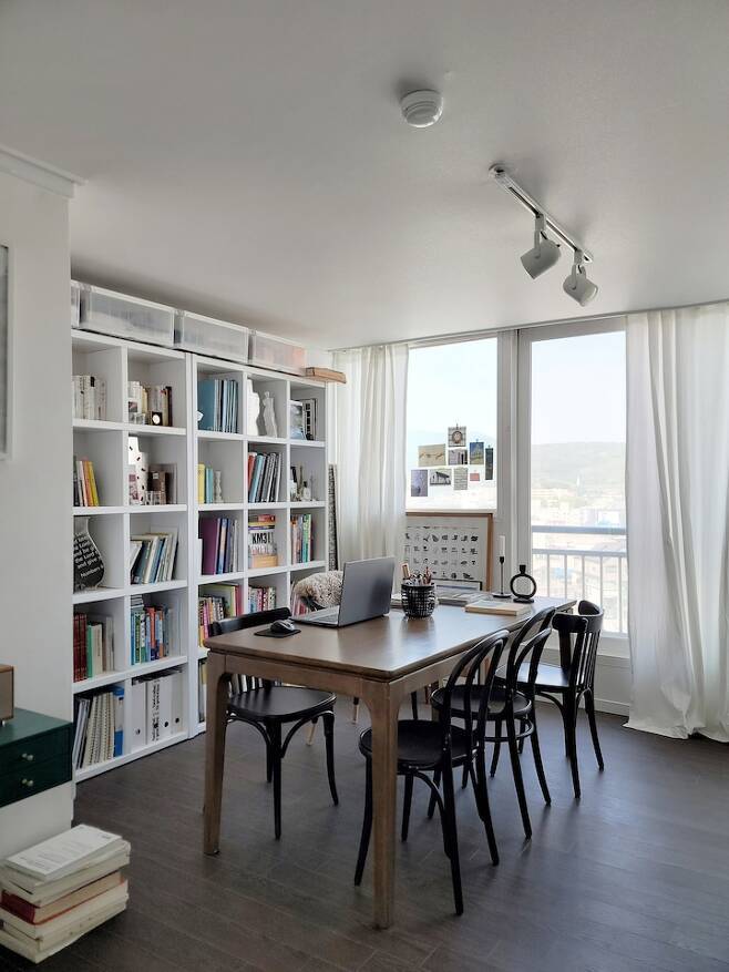 서재는 제가 주로 시간을 보내는 곳인데 6인 테이블을 중앙에 배치해서 노트북을 올려놓고 작업을 하거나, 책을 읽을 때 주로 사용합니다. 저의 소중한 1인 오피스 공간 이자 손님들이 식사도 하고 차를 마시기도 하는 카페 같은 공간입니다.