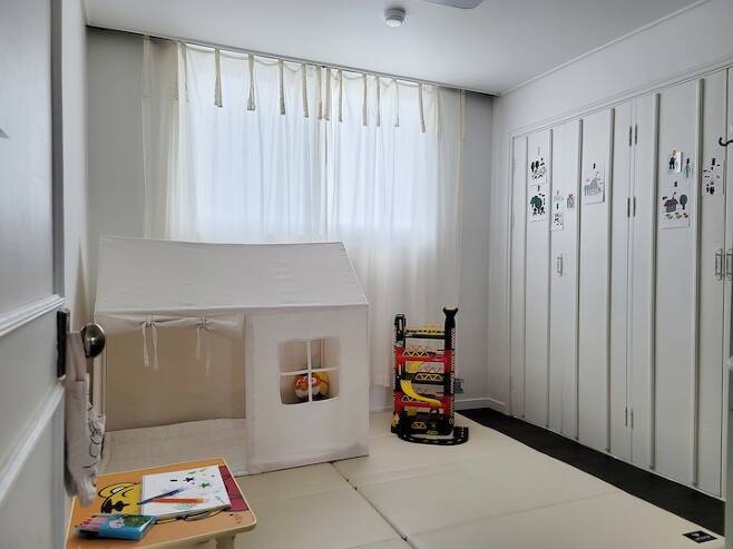 아이 방은 아이가 좀 더 크면 안방을 아이에게 내어주고 이 방에는 침대만 두어서 저희 부부가 사용할 예정이라 크게 손을 대지는 않았습니다. 여기서는 주로 놀고 잠은 저희 부부와 함께 안방에서 같이 자고 있습니다.