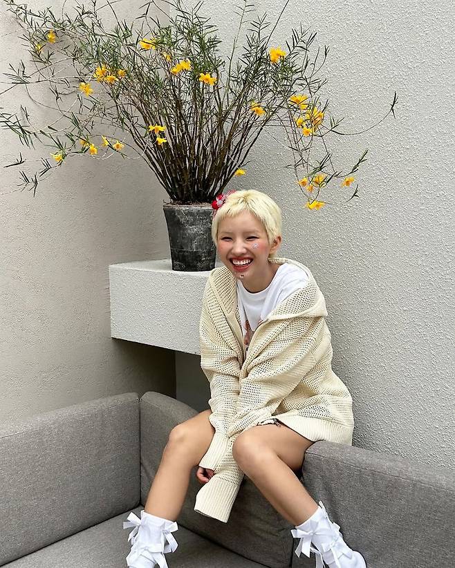 특히 눈에 띄는 건 니트 후디의 질감이다. 촘촘하면서도 통기성이 좋은 짜임 덕분에 초여름에도 부담 없이 활용 가능하며, 후드를 머리에 가볍게 눌러쓴 스타일링으로 귀여우면서도 개성 넘치는 연출이 가능하다. 헤어에는 빨간색 머리핀과 데코레이션을 더해 키치한 무드도 한층 강조했다. 입술과 볼에 스티커를 붙여 포인트를 준 것도 Y2K 감성을 떠올리게 하며, 그녀만의 감각을 엿볼 수 있다.