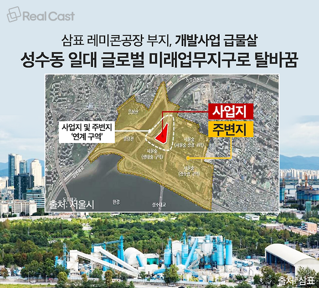 성동구 삼표레미콘 부지 개발사업은 용산철도정비창 부지, 상암 디지털미디어시티(DMC) 랜드마크 빌딩, 종로·중구 세운재정비촉진지구 등과 함께 서울 랜드마크급 개발사업으로 꼽힙니다.