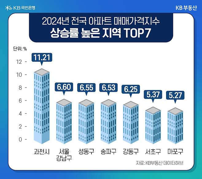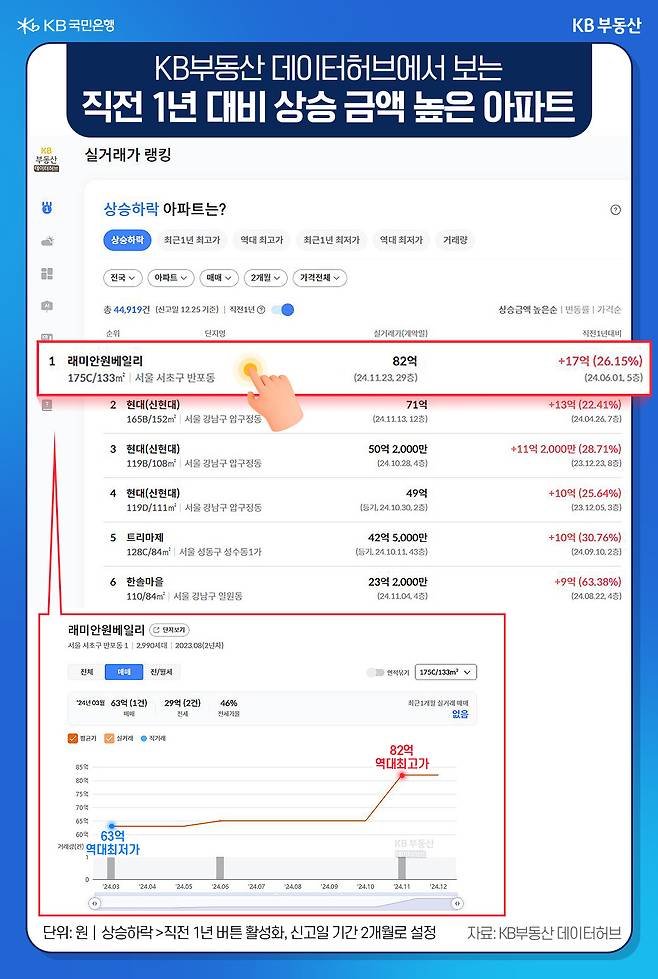 오늘은 2024년을 마감하며 최근 1년 새 많이 오른 지역과 단지를 찾아봤습니다. 밝아오는 2025년엔 더욱 건강하시고 행복한 일이 많길 바랍니다. 내년에도 KB부동산에서 손쉽게 부동산 정보를 찾아 다양하게 활용해 보시기 바랍니다.