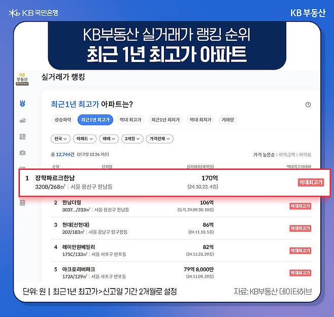 그럼 실거래가는 어디가 가장 높았을까요? 최근 1년 최고가에 따르면, 서울 용산구 한남동 장학파르크한남 전용 268㎡가 10월 170억원에 거래돼 가장 높은 실거래가를 기록했습니다. 이후 한남더힐 전용 233㎡ 106억원, 강남구 압구정동 현대(신현대) 전용 183㎡ 86억원 순입니다.