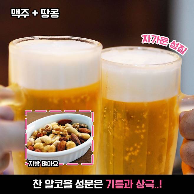 맥주는 기본적으로 찬 음식이에요. 그렇기 때문에 지방 함유량이 높은 땅콩과 같이 먹으면 장에 부담주어 소화불량으로 이어질 수 있어요. 따라서 맥주에는 기름기가 많은 음식보다는 과일이나 먹태같은 안주가 제격!