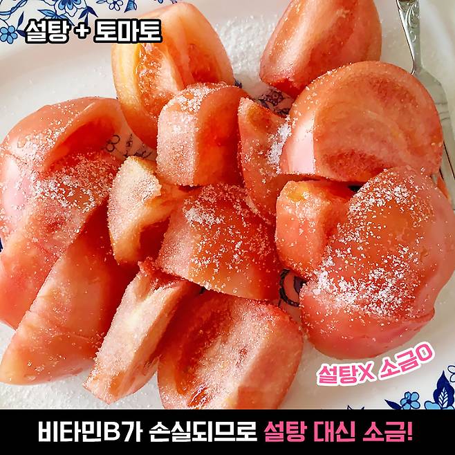 토마토에 설탕을 뿌려 먹으면.. 이 좋은 성분들이 말짱 도루묵이 된다구요! 토마토 내에 있는 비타민B가 설탕을 대사하는 데 사용되기 때문에 비타민 손실이 일어나요. 그러나 한 가지 반가운 소식은 토마토와 소금과는 찰떡 궁합! 그러니까 이제 설탕 대신 소금을 살짝 뿌려 먹도록 해요.