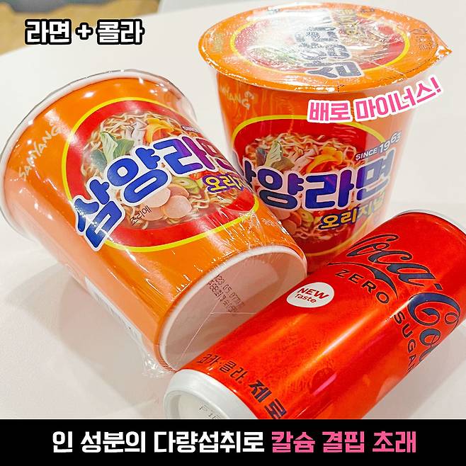 라면의 매콤~함과 느끼~함을 잡아주기 위한 건 콜라밖에 없다구요? 사실 이 조합도 우리 몸에는 좋지 않다는 사실. 두둥! 물론 인스턴트 라면과 콜라를 같이 먹지 않더라도, 장기간 다량 섭취하면 몸에 좋지는 않죠 ㅎ.ㅎ 그러나 둘이 같이 먹으면 마이너스 효과가 배가 되니 더 조심~