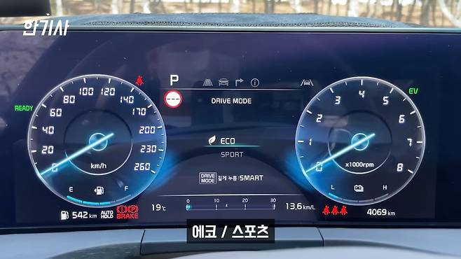 또 다른 단점은 드라이브 모드가 3가지밖에 안 돼요. 에코, 스포츠, 꾹 누르면 스마트 모드까지 이렇게 3가지인데, 스마트 모드는 커스텀 모드로도 바꿀 수 있긴 해요. 근데 커스텀 모드로 바꾸면 또 스마트 모드가 안 되는 거예요. 그래서 3가지라고 볼 수 있는 거죠. 아무리 전기차고 하이브리드 차라도 해도 노말로도 운행하고 싶은데, 컴포트 모드 자체가 없어요. 시동 걸면 에코예요. 그리고 고속도로에서는 달리고 싶어서 스포츠 모드로 바꾸면 안 느껴져요. 조금 더 하드해진다는 정도죠.