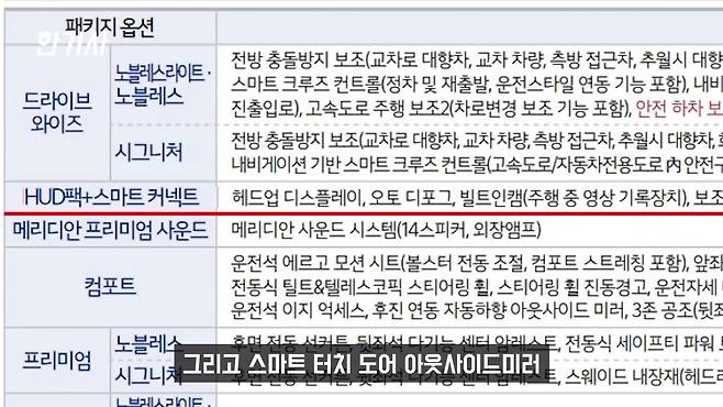 K8이 옵션 장난질이 굉장히 심하다고들 하는데, 그게 정답인 것 같습니다. 다른 거는 그나마 괜찮아요. 어떻게 묶여있던 간에요. 근데 HUD 옵션이 160만 원이고요. 근데 이거랑 빌트인 캠, 스마트 터치 도어, 아웃사이드 미러 등 이렇게 몇 가지가 묶여있는데, 빌트인 캠을 저는 싫어하거든요. 저도 주행할 때만 하는 걸로 설정을 해놓고 있어요. 그래서 블랙박스도 한 개 더 달아놨고요. 솔직히 빌트인캠은 안 넣고 싶었어요. 보조 배터리까지 같이 묶여있거든요. 그러다 보니까 연비도 떨어지게 되죠. 이런 옵션들을 거부할 수 없게 HUD랑 묶어서 만들어놓은 진짜 옵션 장난질의 끝판왕이라고 할 수 있습니다.
