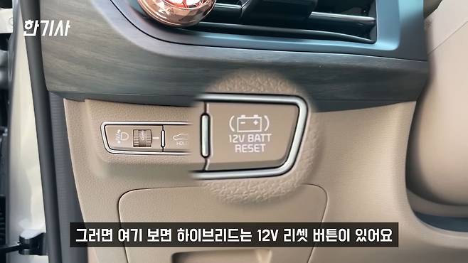 그리고 조금 아쉽게 느껴지는 부분이 있는데요. 세차할 때 배터리 방전이 잘 돼요. 이 차 같은 경우는 지금 12V 배터리가 없어요. 이게 세차를 하다 보면 계속 알림이 와요. 세차할 때 보통 문을 열었다 닫았다, 트렁크를 열었다 닫았다 많이 하시는데, 그게 켜졌다 꺼졌다 자꾸 반복하다 보면 알림이 뜨다가 나중에는 방전돼 버려요. 방전이 될 것 같으면 차단을 시켜버려요. 하이브리드는 리셋 버튼 있어요. 리셋 버튼을 누르고 15초 안에 시동을 걸면 배터리가 살아나긴 하거든요.