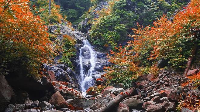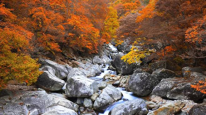 💦 칠선계곡: 늦가을 물줄기와 낙엽이 어우러진 색채의 미학