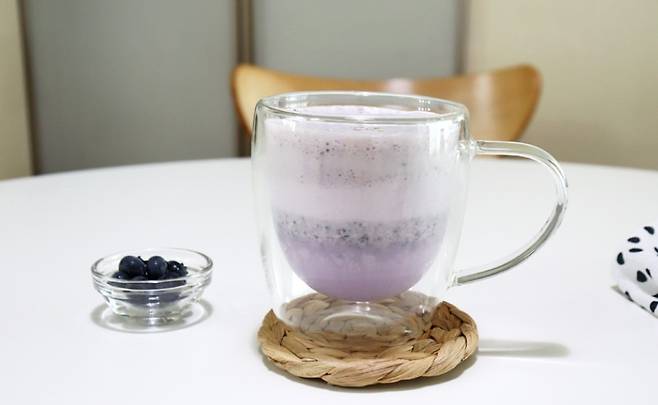 재료: 무가당 플레인 요거트 1개 (약 100g), 아마씨 가루 또는 치아씨드 1/2 작은술, 냉동 베리류 (블루베리 등) 5~7알.