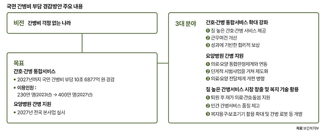 경감방안에서는 이를 더 많은 국민이 부담 없이 이용할 수 있도록 확대·강화했습니다. 또 정부는 요양병원에서도 간병 지원을 받을 수 있도록 단계적으로 제도화할 방침입니다.
