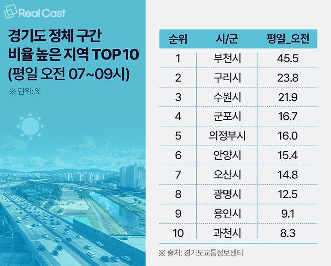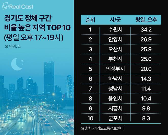 그렇다면 과연 경기도에서 평일 가장 교통 체증이 심한 도시는 어디일까요? 금일 리얼캐스트에서는 경기도교통정보센터의 시군별 정체 구간 비율 자료를 분석해 교통 체증이 가장 심한 도시를 선정해 봤습니다.