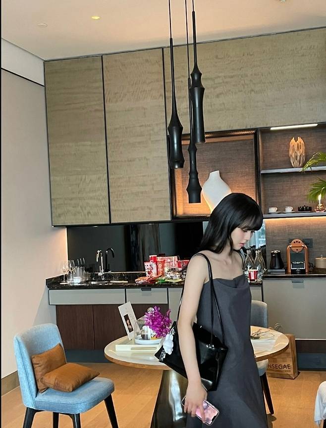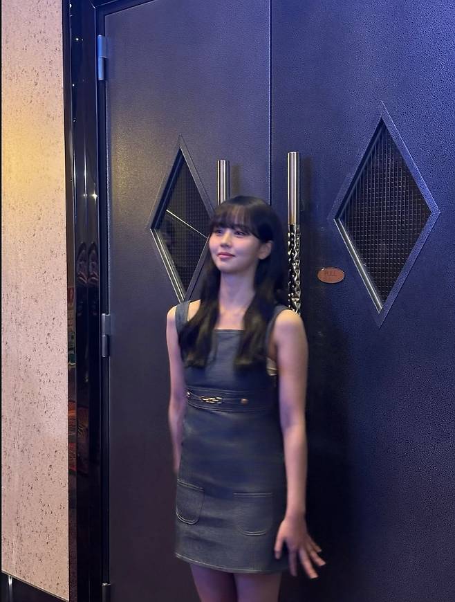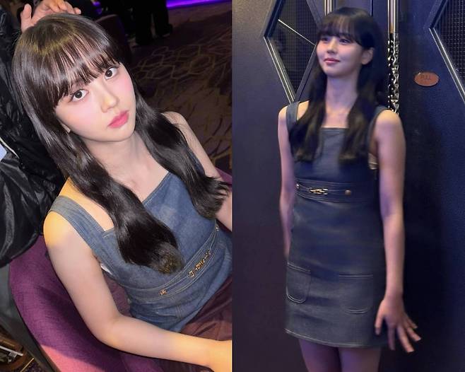 김소현은 몸에 착 붙는 슬리브리스 데님 미니 원피스를 착용해 청량하면서도 세련된 룩을 연출했습니다.