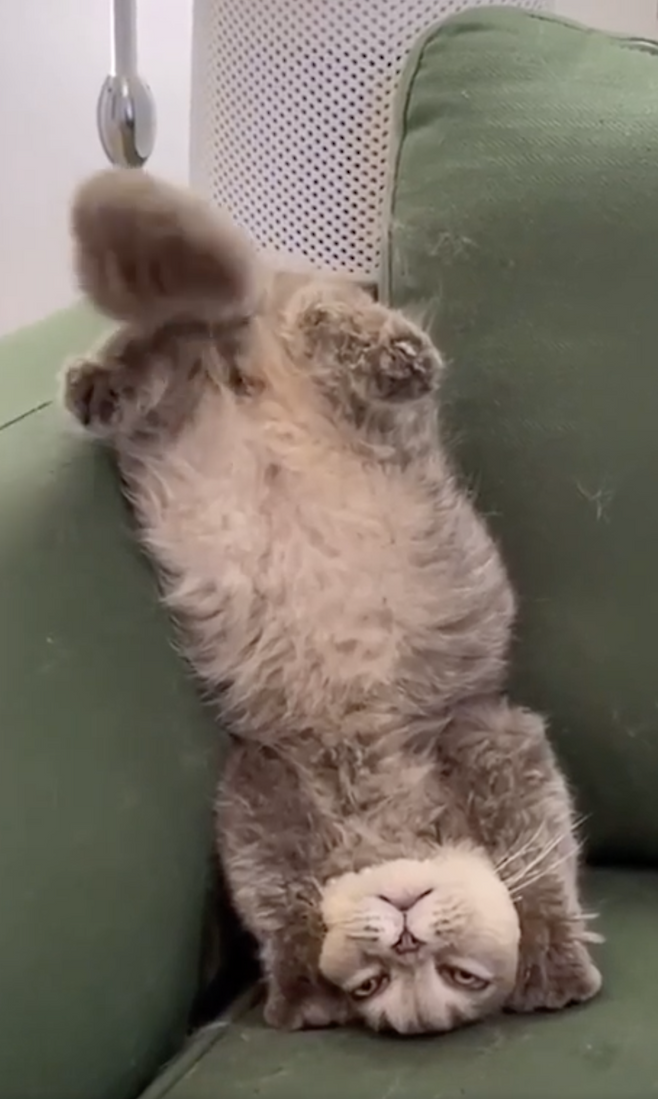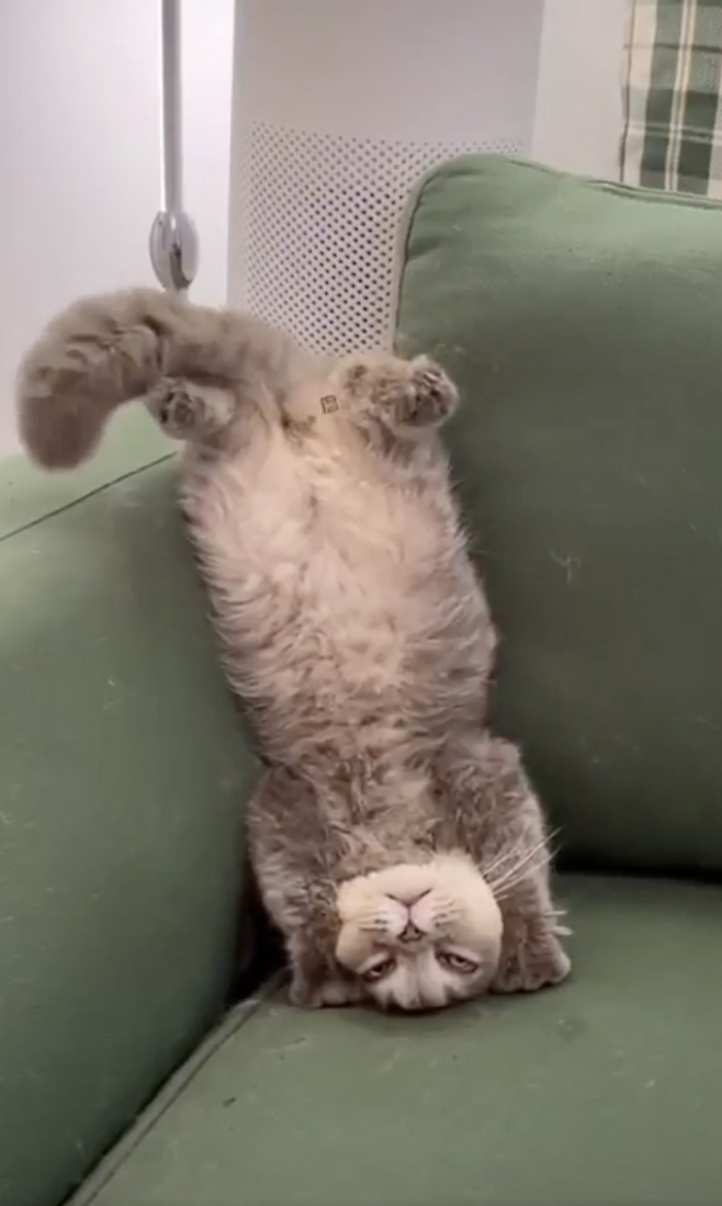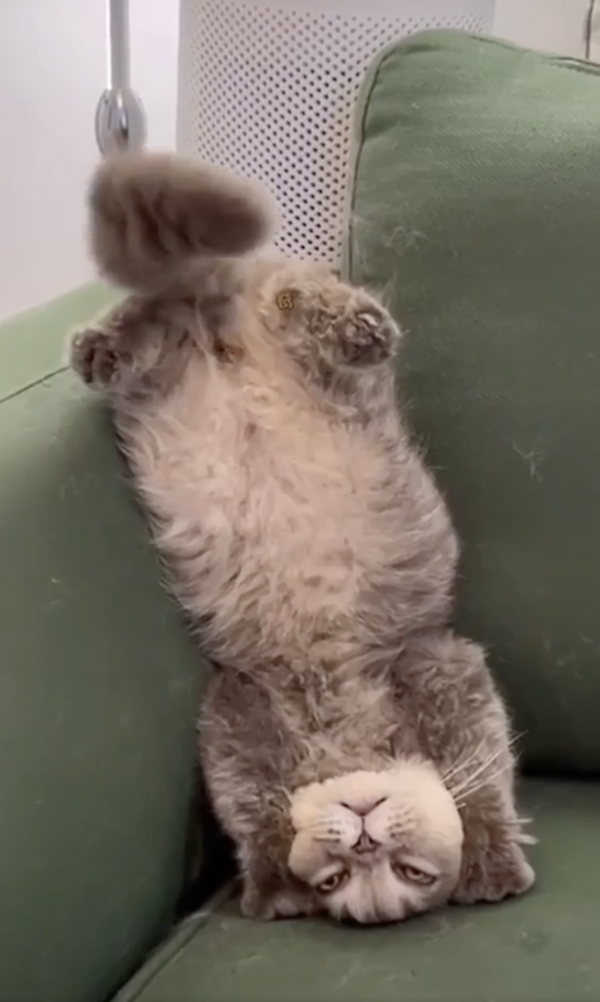 해당 고양이의 모습은 영상을 통해 공개됐으며, 영상 속 고양이는 부드러운 회색 털과 둥근 얼굴로 귀여운 매력을 발산합니다. 소파 모서리에 몸을 기대고 두 앞발과 뒷발을 공중으로 올린 채 뒤집혀 있는 모습은 마치 요가 동작을 연상케 합니다. 이 상태에서 고양이는 지그시 반쯤 감긴 눈으로 태연히 주인을 바라보고 있어, 보는 이들에게 웃음을 자아냅니다.