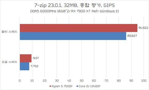 자료 공유 과정에서 압축 프로그램은 여전히 필수인 만큼 PCMark10에 이어 무료 압축 프로그램인 7-zip의 성능을 측정했는데, 부스트 클럭이 더 빠른 라이젠 5 7500F가 7-zip 싱글 스레드 테스트는 물론 멀티 스레드 테스트에서도 더 높은 성능을 내주는 것으로 나타났다.