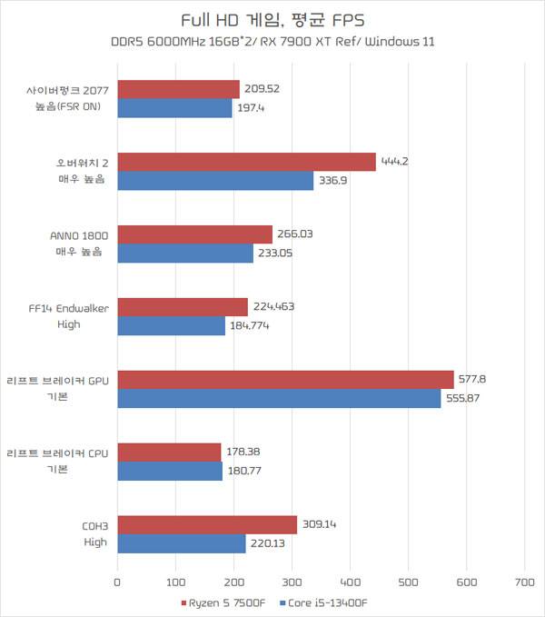테스트 그래픽 카드는 라데온 RX 7900 XT 레퍼런스 버전과 기사 작성 시점에서 최신 버전 드라이버인 RSAE 23.7.1을 설치한 상태로 진행했는데, 라이젠 5 7500F가 전체적으로 더 좋은 성능을 내준다.